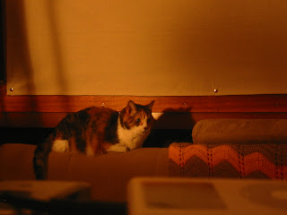 Here is the cat looking more awake than usual in front of a new curtain.